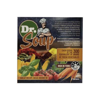 Consumers are advised to choose at least one serve of fresh green leafy vegetables to complement the variety supplied in a Dr. Soup® sachet. Most nutrients are retained when a vegetable is dehydrated but fresh greens are the exception, losing most of their folate, an essential vitamin. This is why Dr. Soup® has focused on vegetables, herbs and spices other than greens. One standard 75-gram serve of fresh broccoli or other green leafy vegetable, together with 300 grams fresh equivalent in one Dr. Soup® sachet provides the daily recommendation of at least 375 grams of vegetables (5 serves).