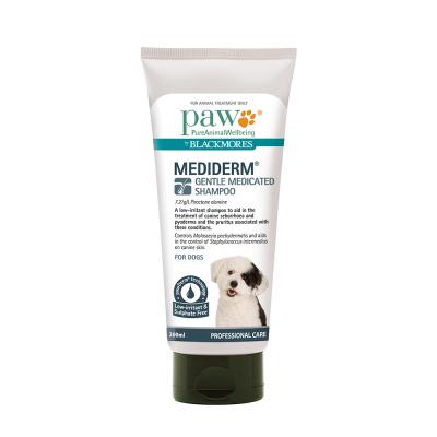 PAW MediDerm Gentle Medicated Shampoo is an effective low-irritant, antibacterial and antifungal shampoo that is gentle on the skin. Combining, Piroctone Olamine, a veterinary active, with pawDerm sulphate free technology, PAW MediDerm Shampoo.